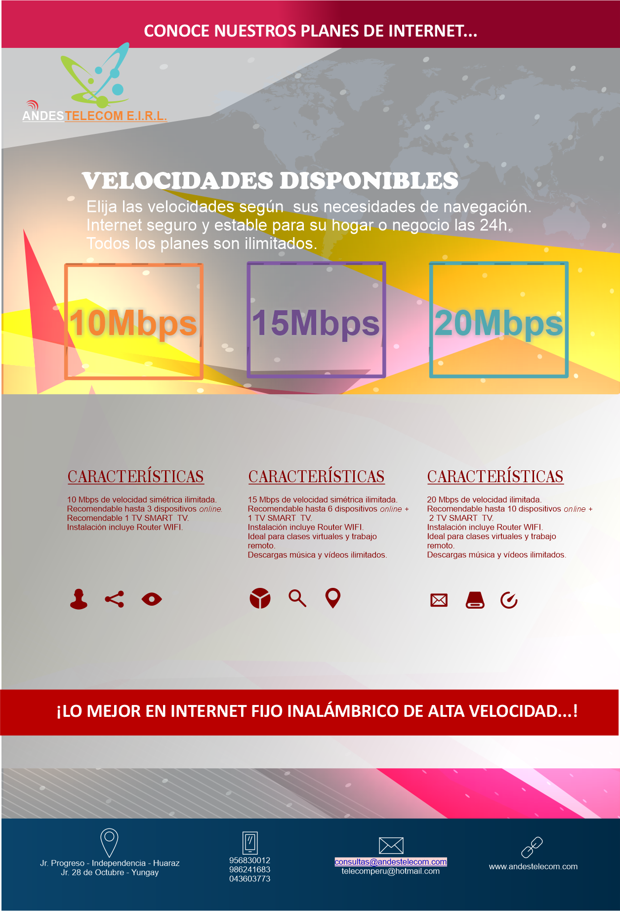 Contamos con planes de Internet para su Negocio u Oficina. Planes accesibles de 20Mbps, 30Mbps, 40Mbps,50Mbps disponibles en cualquier parte del Perú y el Mundo.Internet Dedicado.